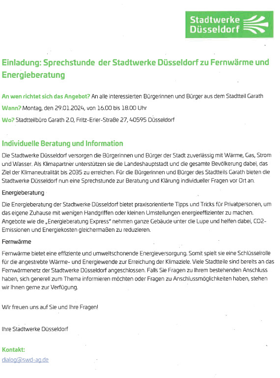 Einladung: Sprechstunde der Stadtwerke Düsseldorf zu Fernwärme und Energieberatung