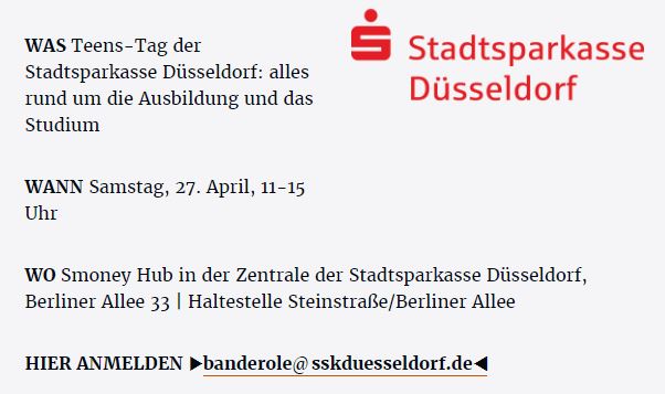 Von 11 bis 15 Uhr erwartet die Gäste ein abwechslungsreiches Angebot. Sie starten im Smoney Hub, dem modernen Treffpunkt für junge Menschen, besuchen den geheimnisvollen Raum mit dem Safe und erfahren hoch über den Dächern der Stadt auf der 20. Etage alles Wichtige über Möglichkeiten für den Berufseinstieg bei der Stadtsparkasse Düsseldorf. An Ständen stehen Ansprechpartner zur Beantwortung von Fragen rund um die Ausbildung bereit.