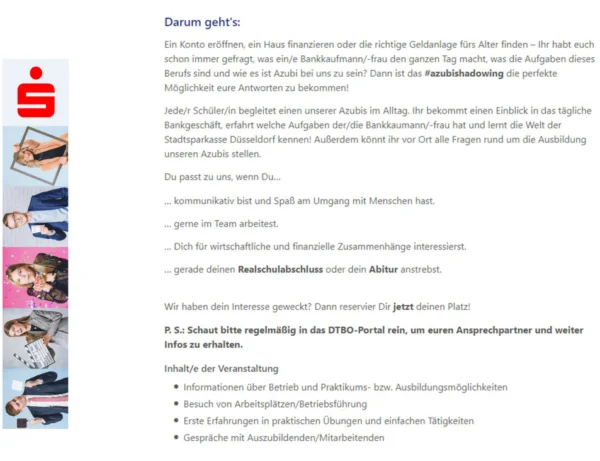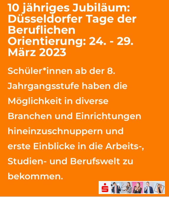 Jetzt anmelden! Düsseldorfer Tage der beruflichen Orientierung (DTBO) bei der Stadtsparkasse Düsseldorf – ein Tag #azubishadowing 16. Januar 2023 von mbeese in Ausbildung, Beruf, Familie, Kinder & Jugend