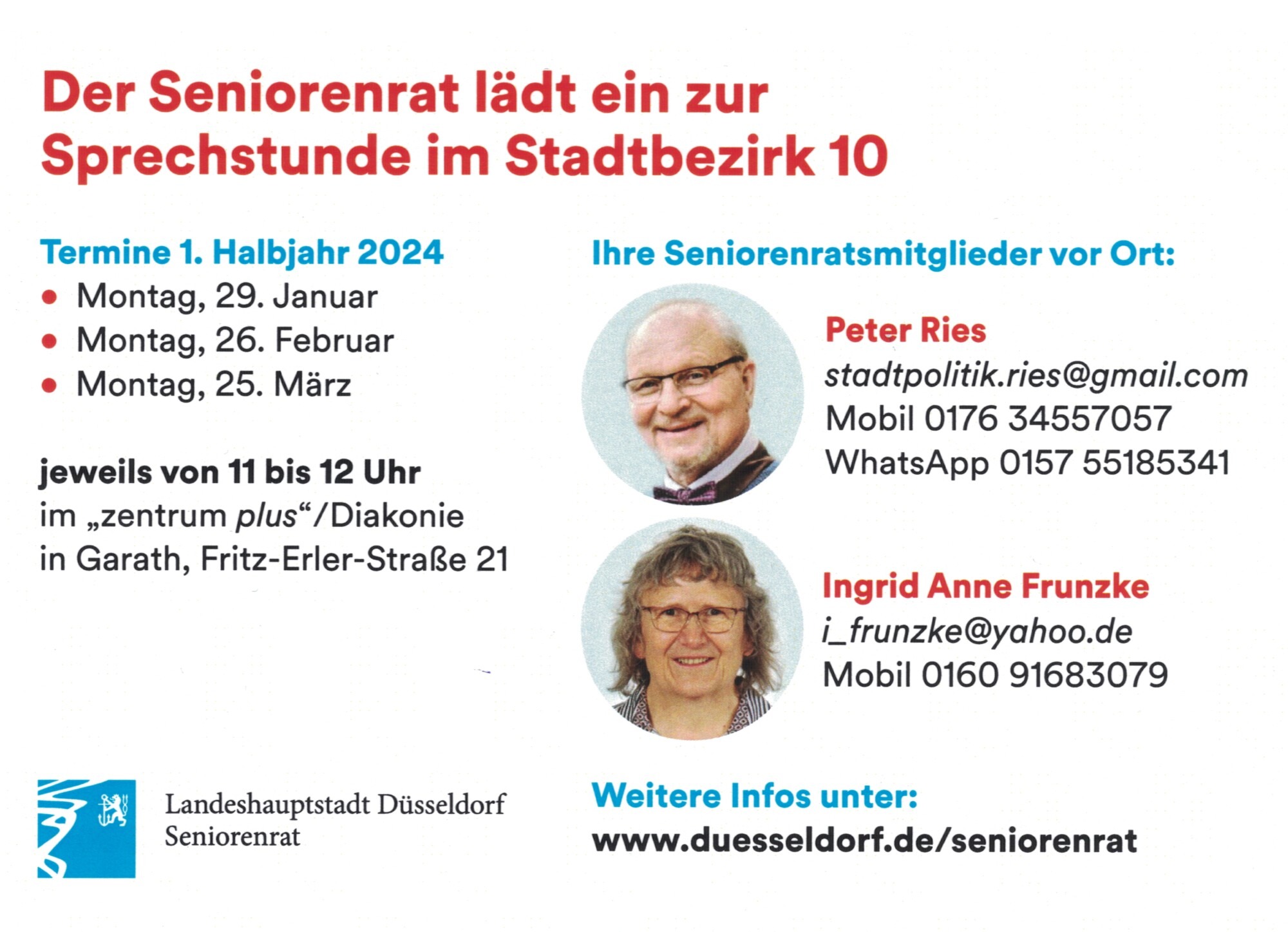 Sprechstunde Seniorenrat SB10 Garath/Hellerhof am 25. März 2024 11 Uhr im „zentrum plus“/Diakonie Garath, Fritz-Erler Str. 21