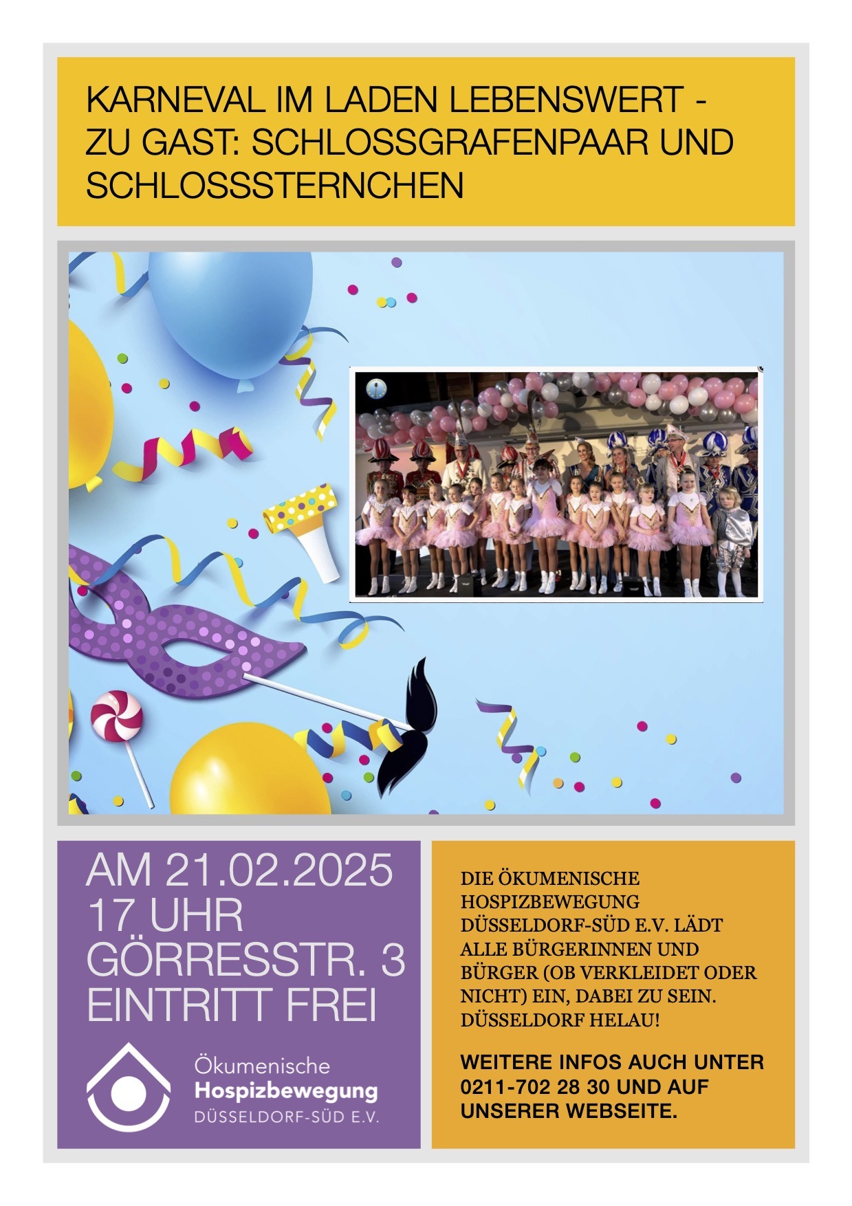 Am Freitag den 21. Februar um 17 Uhr lassen wir es im Laden LebensWert krachen: Wir bekommen Besuch vom Benrather Schloßgrafenpaar und den Schlosssternchen und alle Freunde, Nachbarn und Interessierte sind herzlich eingeladen. Der Eintritt ist frei. Für Getränke und Verpflegung ist bestens gesorgt.