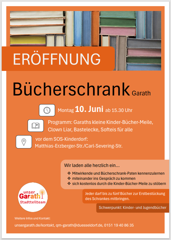 wir freuen uns sehr, Euch zur Einweihung des ersten Bücherschranks in Garath einzuladen!