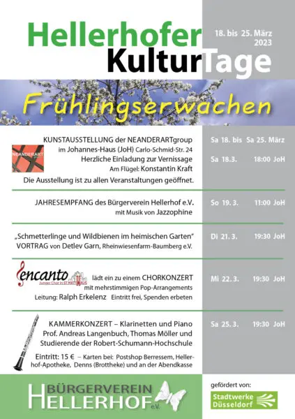 Der Frühling kommt, die Natur erwacht….. der Bürgerverein Hellerhof e.V. feiert das mit einer Woche „Frühlingserwachen“ und einer Vielzahl von Veranstaltungen vom 18.03. bis zum 25.03. Wir freuen uns auf ein aktives Jahr in Hellerhof und auf reges Interesse und Beteiligung an unseren Angeboten in dieser Woche: Kunstausstellung, Vortrag, Chorkonzert und Kammerkonzert, Jahresempfang des Bürgervereins und 2. Hellerhofer Frühjahrsputz.