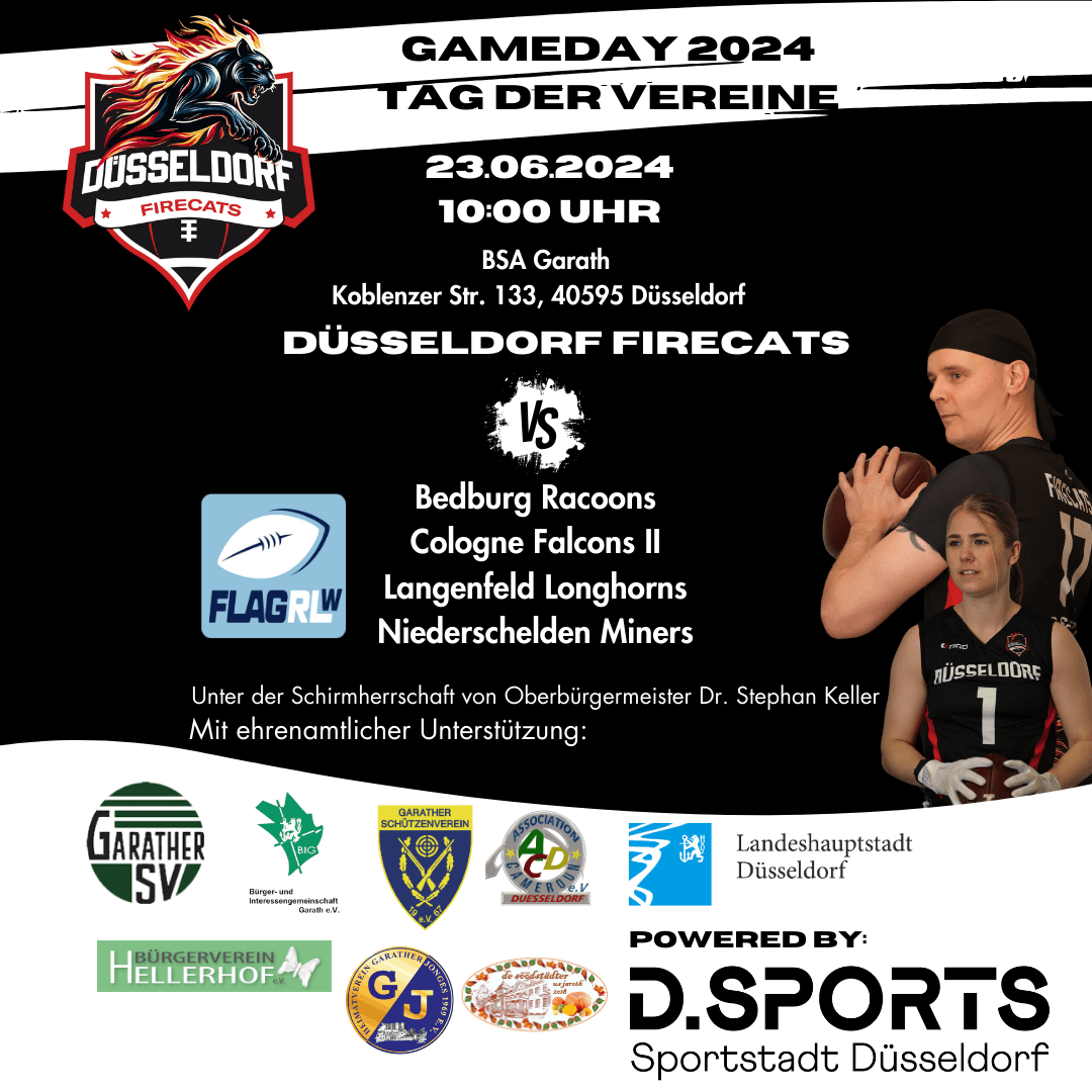 Doch auch neben dem Platz ist im Zuge des „Tag der Vereine“ so einiges geboten. Die Idee für das Rahmenprogramm, die von Peter Heinen (Vorsitzender Garather Sportverein und Jonges) sowie Bezirksbürgermeister Jürgen Bohrmann stammt, wurde in Zusammenarbeit mit vielen verschiedenen lokalen Vereinen, sowie der Stadt Düsseldorf und D. Sports realisiert. Das Endergebnis ist ein Fest für die ganze Familie, das unter der Schirmherrschaft des Düsseldorfer Oberbürgermeisters Dr. Stephan Keller stattfinden wird. Neben Live-DJ, Grillstand, Getränkewagen und African Food Taste, können sich die Zuschauer auch auf eine Präsentation der verschiedenen Vereine sowie auf Merchandise und Spieler der Firecats und Panther freuen.