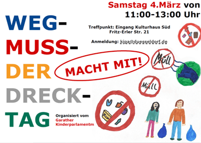 Das Garather Kinderparlament ruft am 4. März 2023 von 11 bis 13 Uhr alle Bürgerinnen und Bürger dazu auf, den Stadtteil sauber zu machen und wird selber natürlich auch fleißig Müll sammeln. Treffpunkt ist am Nikolaus-Groß-Platz vor dem Kulturhaus Süd. Dort gibt es Müllsäcke, Zangen und Westen.